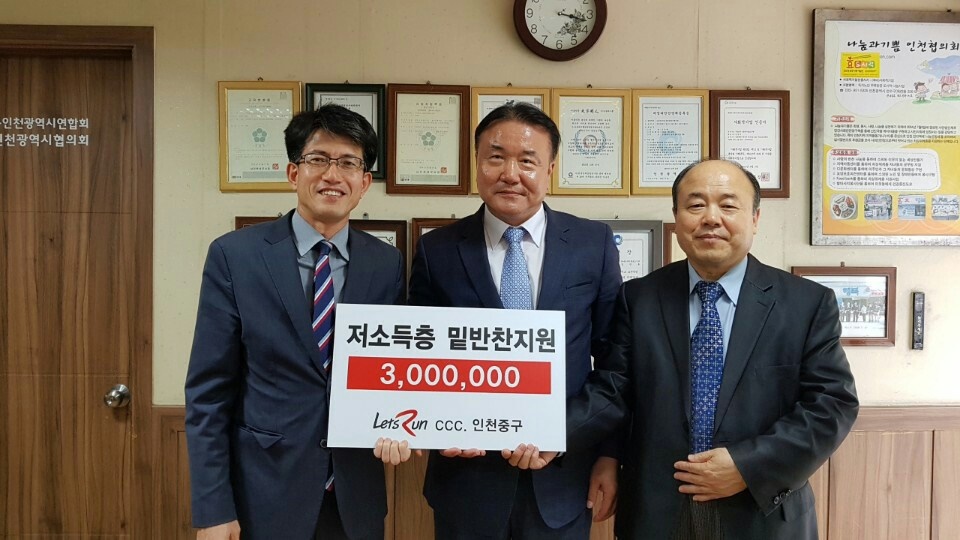지난 5월 12일 한국 마사회 인천중구 렛츠런문화공감센터 유성언 센터장은 나눔과 기쁨 인천광역시협의회(회장 김유택)를 방문하여 반찬지원금으로 3,000,000원을 전달하였다.